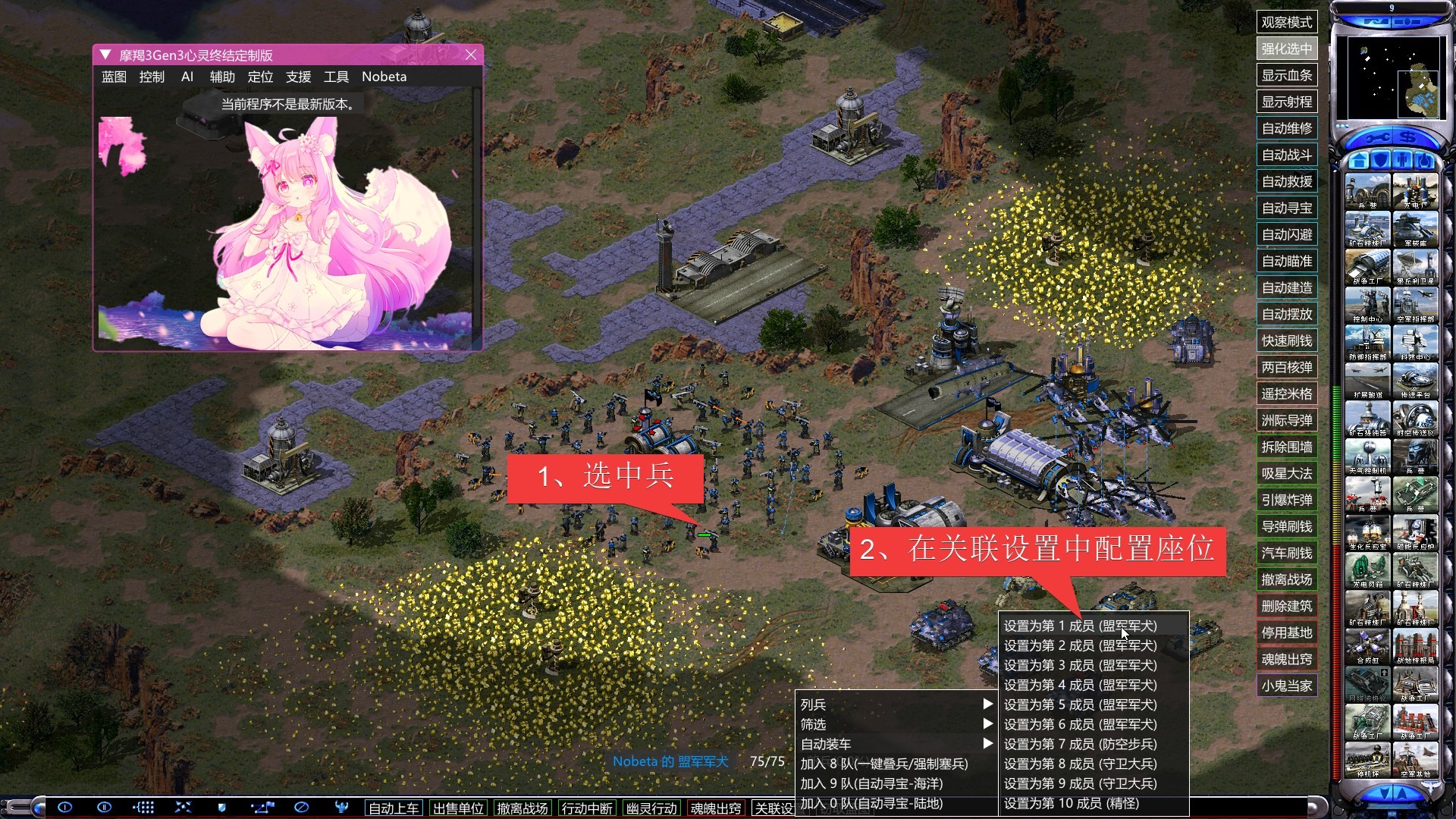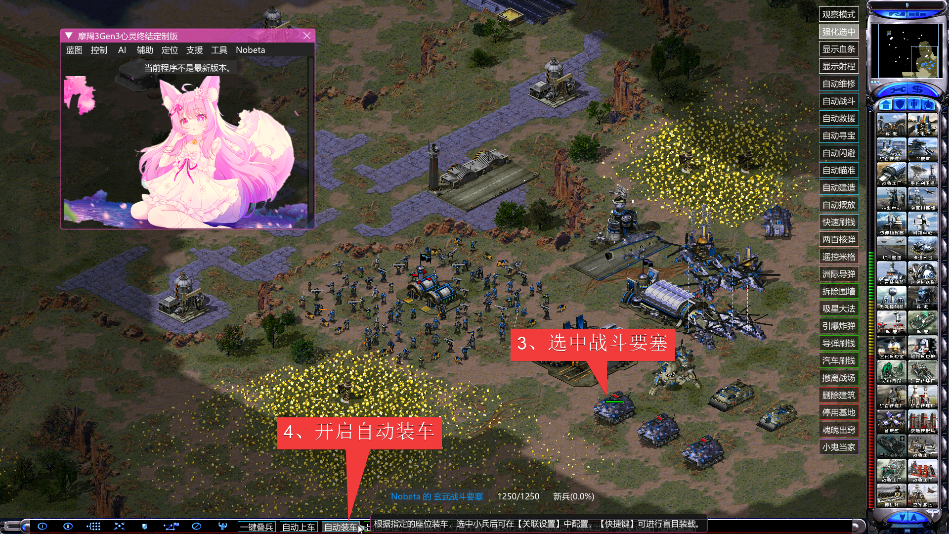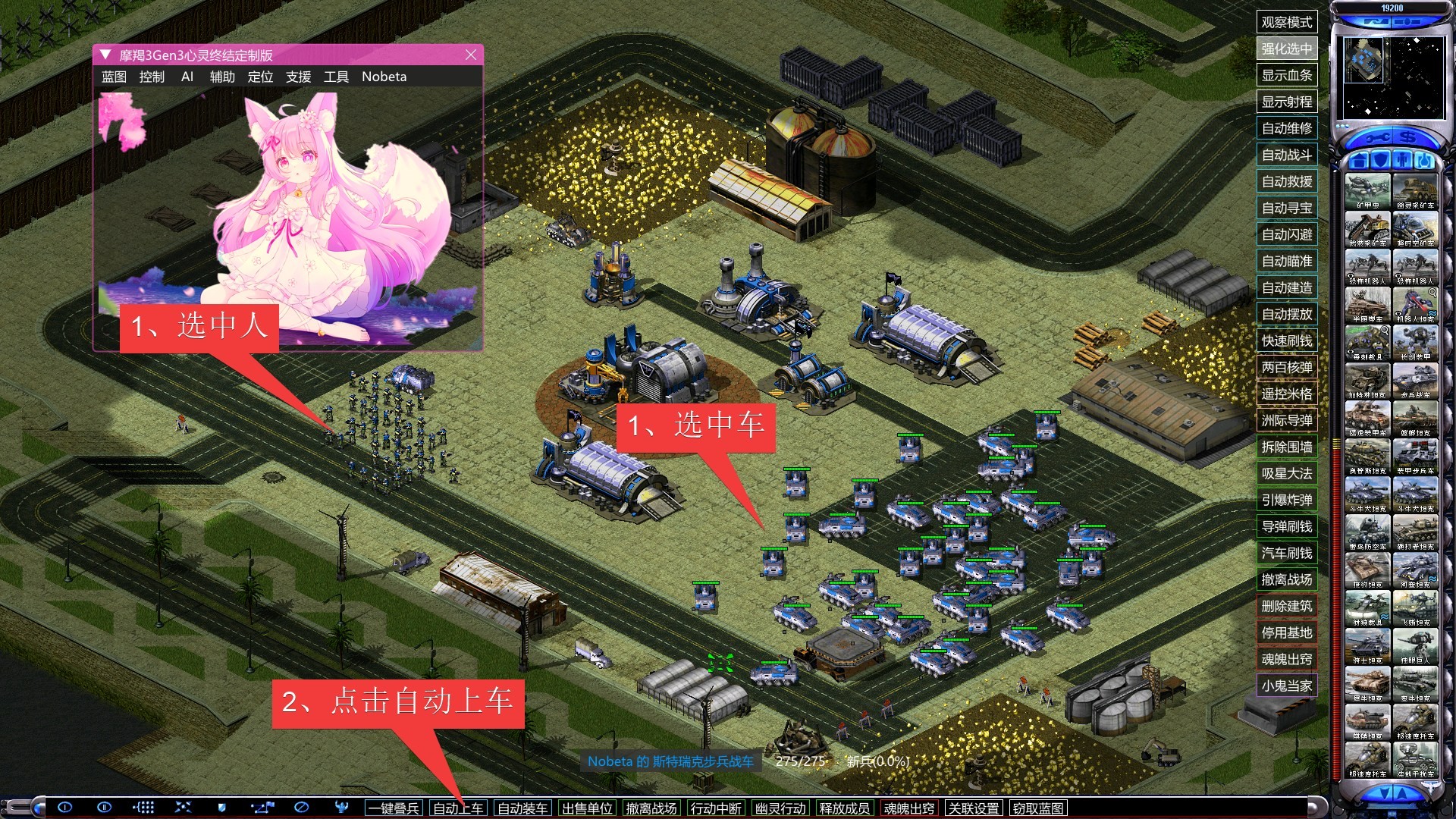 不用选中要装的车,功能自动装载任意步兵成员,一次性把我方阵营所有车装满。