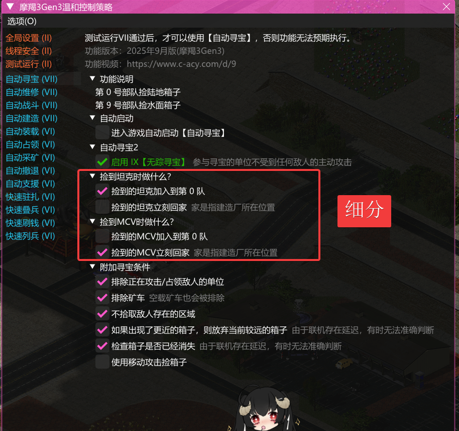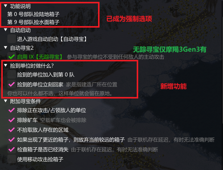 Nobeta 自动寻宝第二代 注意:自动寻宝2是为尤里复仇版本游戏制作的,仅原装的摩羯3Gen2、摩羯3Gen3更新。心灵终结专用版本摩羯3Gen2不更新。 自动寻宝2的设置和初代自动寻宝有区别。 下图是第一代的配置: 下图是第二代的配置: 无踪寻宝 https://www.c-acy.com/d/55 避开无法抵达的区域(2025年9月1日更新) 让捡到的坦克回家(2025年9月20日更新) 如果启用了【无踪寻宝】,那么单位回家时也不会受到敌人的主动攻击。 让捡到的坦克加入到寻宝队列(2025年9月21日更新)
